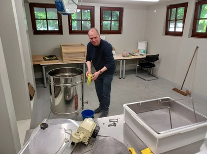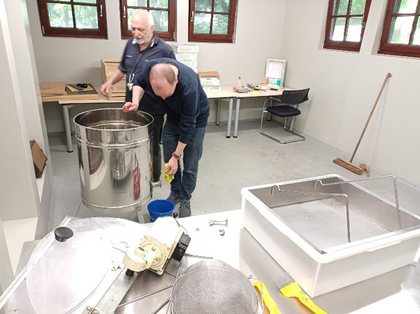 Die Schleuder, die Handgeräte und Siebe sowie das Entdecklungsgeschirr wurden vom Staub der letzten Monate befreit und stehen nun für eine Honigernte nach den Richtlinien des Deutschen Imkerbundes zur Verfügung.